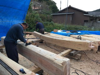 木材加工 当社では、今ではほとんど見られなくなった手刻みによる木材加工を続けています。そのため、プレカットでは取り扱えない大径の丸太材を使用することができ、強度の大きい頑丈な建物を造ることができます。