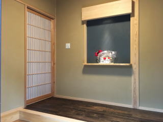 天井は広幅の無垢の板材、壁はLD同様珪藻土によるぬりかべ、障子は昔ながらの縦長の格子を用い、純和風な空間を演出しています。