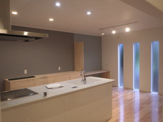キッチン キッチンは対面型とし、リビングとの連続性を考慮することで、子育てをする奥様が子供たちの様子を見ながら家事ができるよう配慮されています。