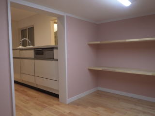 中二階子ども室・下部収納 子ども室を中二階とすることで、下部に収納スペースを確保し、この空間の一部をキッチンのパントリーとして利用できるようになっています。