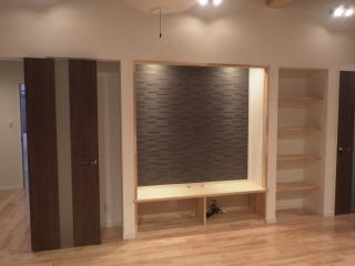 テレビ台はお客様からの要望で造りつけとし、間接照明を用い背部壁面の陰影を際立たせました。