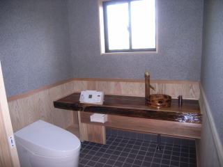 トイレ 手洗い桶、カウンターは大工による作り付けとしました。当社では、こうしたカウンターや、収納、食器棚等も要望に応じてお客様の好みを反映した作り付けとさせていただくことで、後の家具等購入の負担を軽減につながればと考えております。